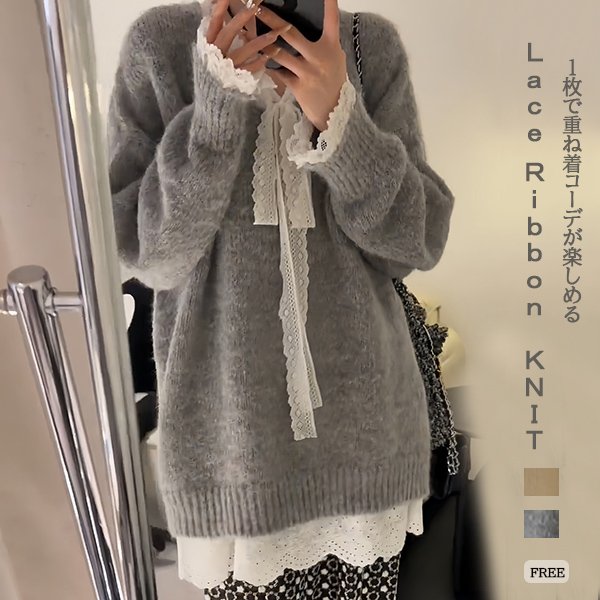 ・1枚で重ね着コーデが楽しめるレースリボンニットトップスです。