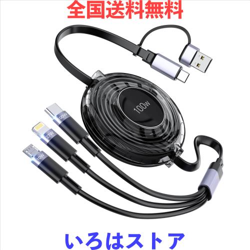 【100W】充電ケーブル 3in2 巻き取り式 充電コード 【PD対応100W/5A】超急速充電 LEDディスプレイ 超高耐久 データ転送 断線防止 iPhone1
