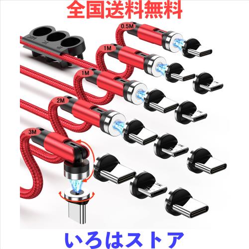 マグネット 充電ケーブル 【5本セット/0.5+1Mx2+2M+3M&12コネクタ】 LEDライト内蔵 USBケーブル 3in1 充電器 マグネット 540°回転可能