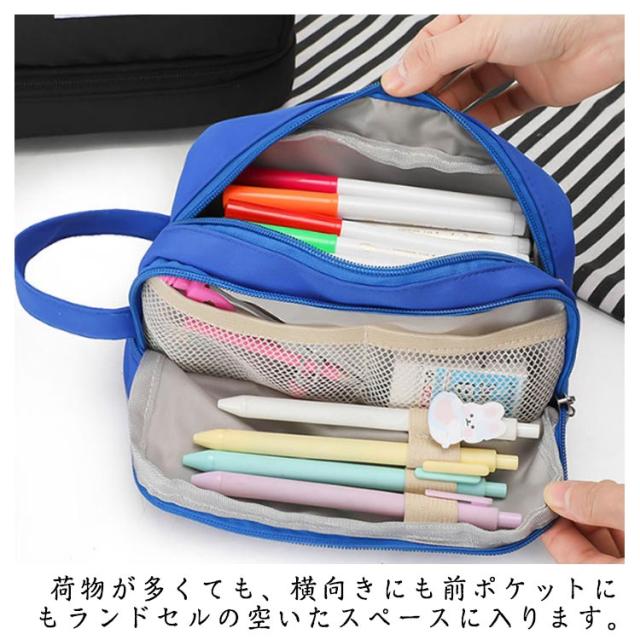 | 軽いのに大容量ペンケース!小学生に必要なものがしっかり収納できます。 ペンケースの中には小さな仕切りのメッシュと弾性テープが設計されて、いろんな文房具を分類収納でき、小物を見つけやすい。 消しゴム、付箋、ハサミ、定規、メジャー、修正テープなどの小物もたっぷり収容できます。所持品や文房具の保管に最適です。 荷物が多くても、横向きにも前ポケットにもランドセルの空いたスペースに入ります。 自分のお気に入りの文房具と合わせたり、自分の好きな色に囲まれて勉強してモチベーションUP。 | |