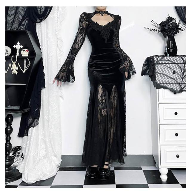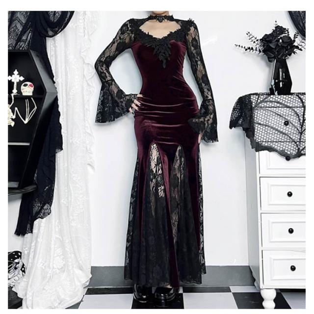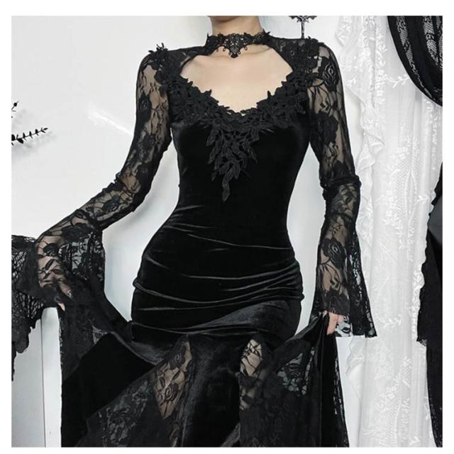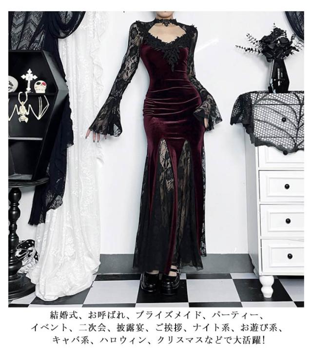 レディース 魔女 レース タイトワンピース パーティー 二次会 ドレス ブラック Vネック 袖あり 長袖 ロング丈 ゴシック ベロア ベルベット マーメイド 黒 レース ゴスロリ ワンピース ビジュアル系 V系 モード系 サブカル パンク お姫様 秋冬