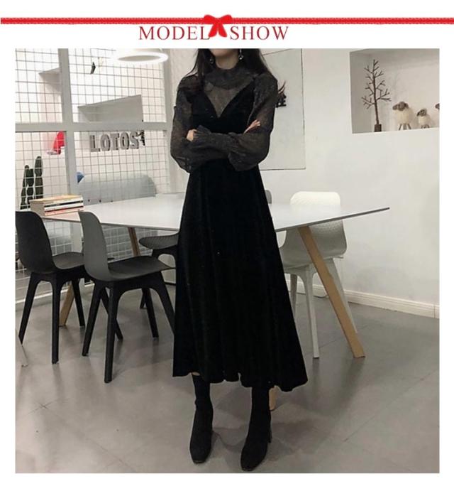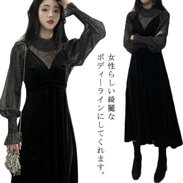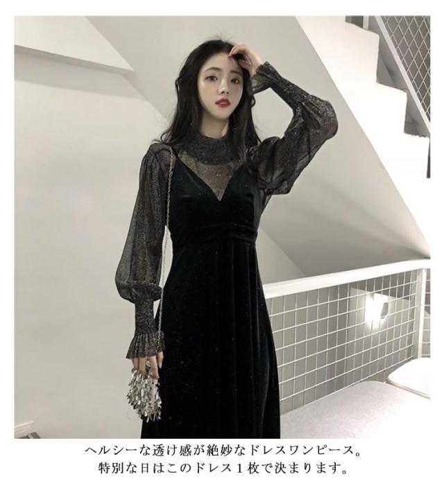 成人式 結婚式 韓国 ワンピース 二次会 秋 パーティードレス 黒 レディース 冬 春 パーティードレス 40代 同窓会 20代 30代 お呼ばれ シースルー キャミワンピース キラキラ ラメ ドレス プルオーバー トップス ベルベット風 ジャンパースカート 2点セット