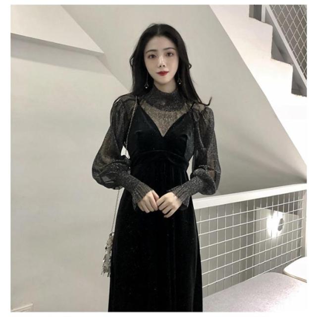 セットアップ 結婚式 ラメ パーティードレス 二次会 ドレス レディース パーティードレス 同窓会 成人式 ワンピース 秋 春 韓国 20代 30代 40代 シースルー キャミワンピース 黒 お呼ばれ キラキラ プルオーバー トップス ベルベット風 ジャンパースカート 2点セット