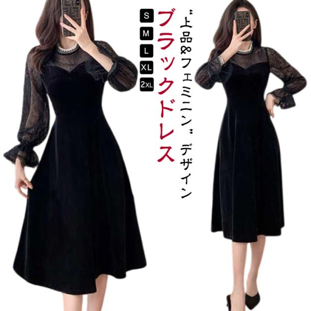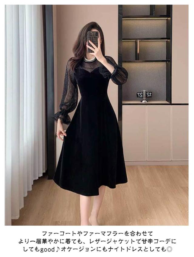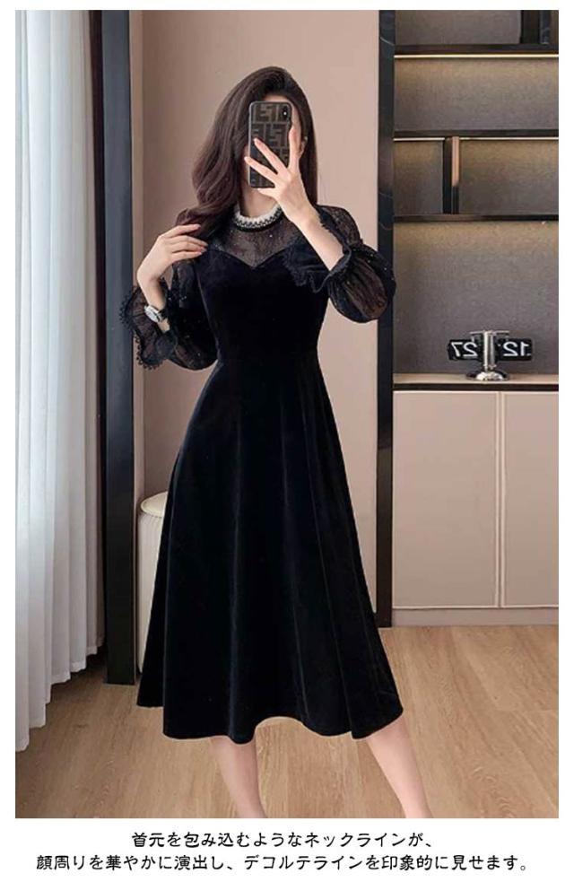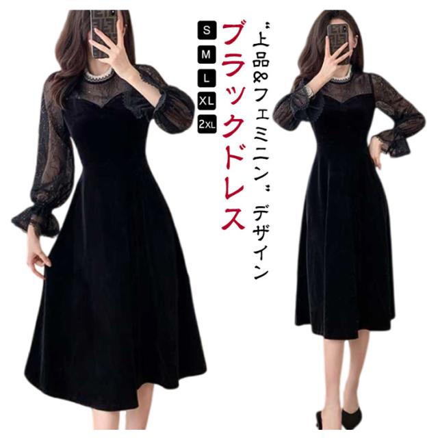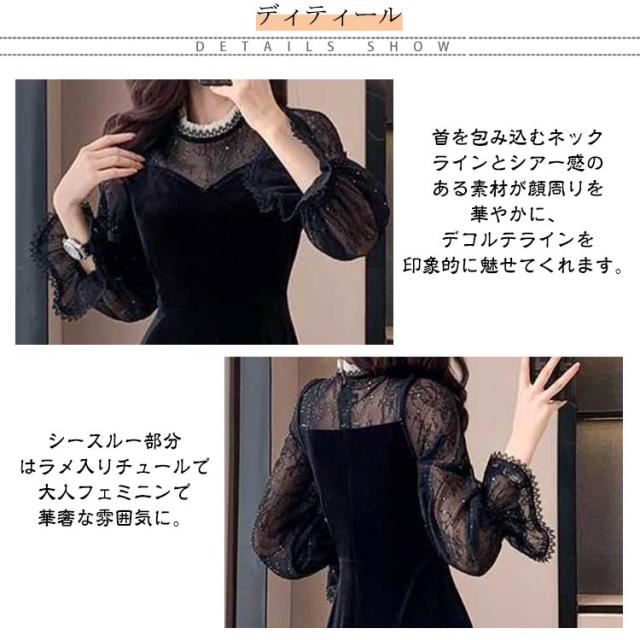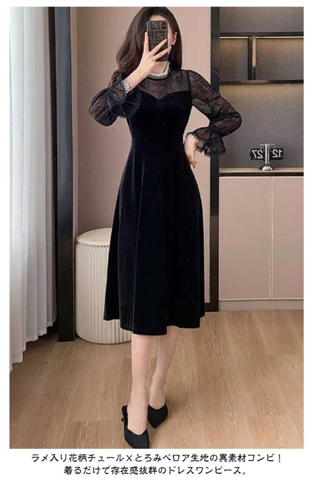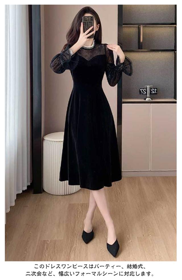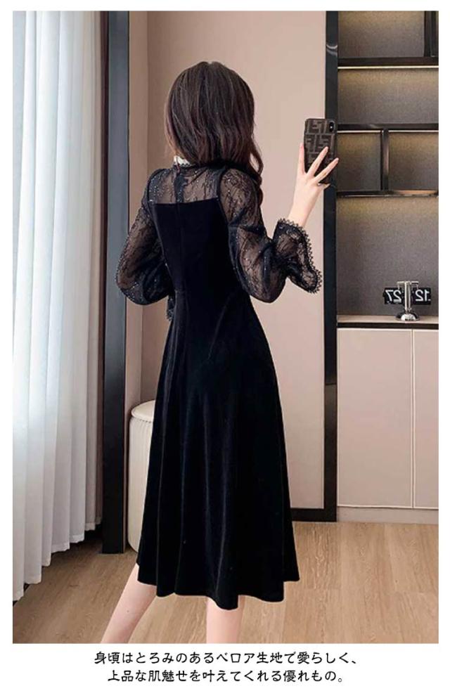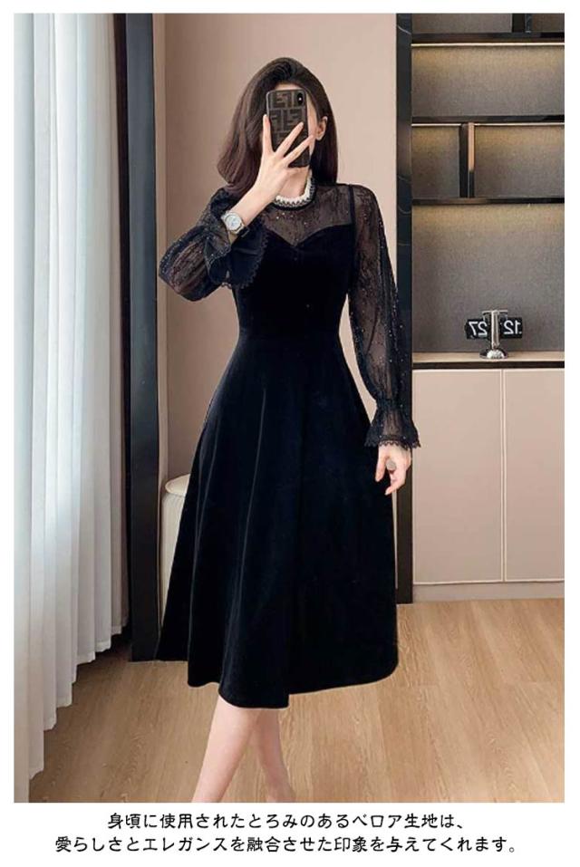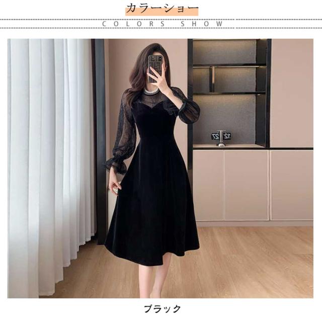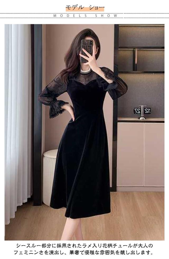 ドレス ワンピース 秋冬 シースルー ラメ入り ブラック 黒 レディース 長袖 Aライン ベロア フォーマル きれいめ 上品 フェミニン パーティー ミニドレス ひざ丈 膝丈 ミニ 刺繍 レース 透け パーティードレス 結婚式 二次会 大人 花柄 春 秋 冬