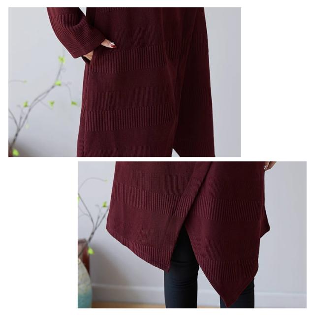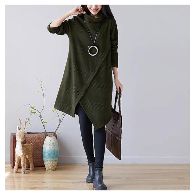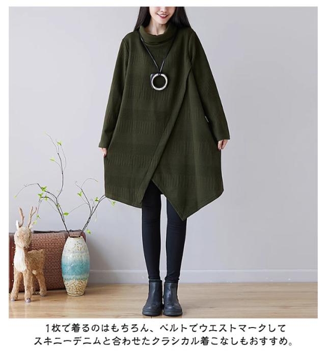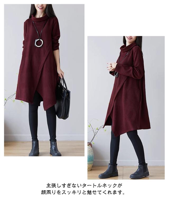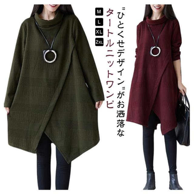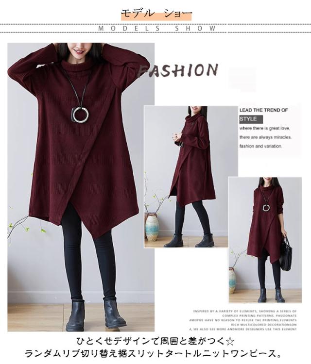 ニット ワンピース リブ スリット タートルネック カジュアル 長袖 ゆったり 上品 清楚 レディース 膝下 膝丈 ミディ丈 ミディアム丈 秋 秋冬 冬 チュニック チュニック丈 膝上 セーター 森ガール 薄手 リブニット 無地 緑 赤 カーキ ボルドー ワイン