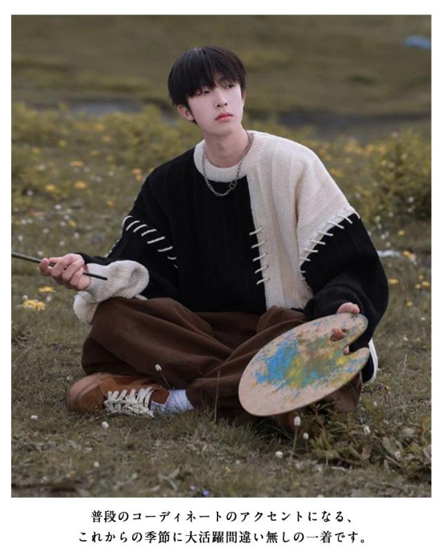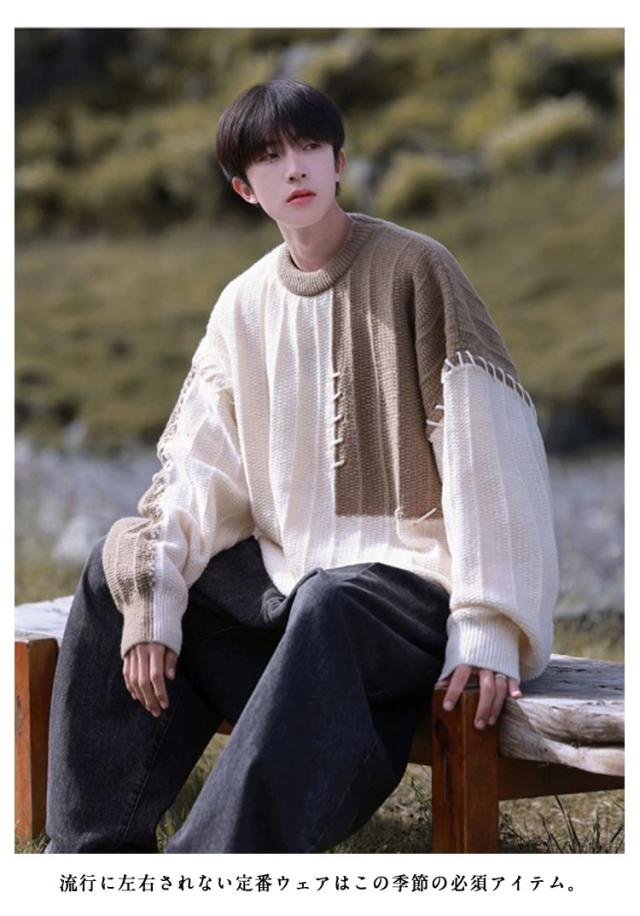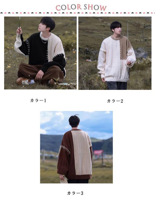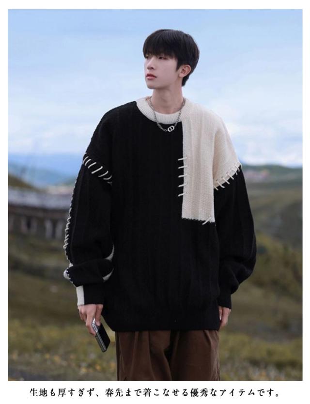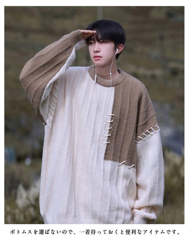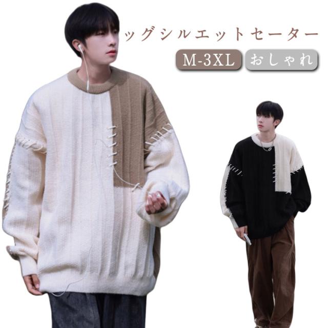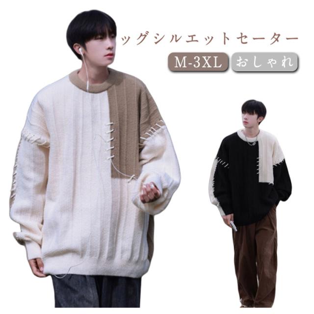 ビッグシルエット セーター メンズ 切り替え 配色 ニットセーター ニットトップス 長袖 ニットソー ゆったり おしゃれ 韓国ファッション M L XL 2XL 3XL