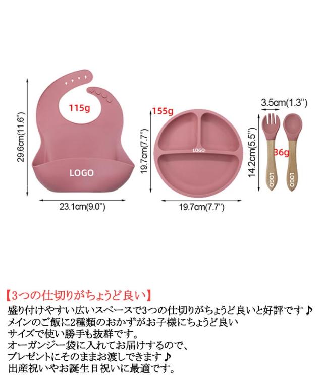 | 5点セット!13colors! 【自分で出来た!を育てる食器セット】 お子さまの「はじめての食事」をもっと楽しく! お子さまのお食事には、安心して使える食器が欠かせません。このベビー用シリコン食器は、柔らかく耐久性のあるシリコン素材で、落としても割れず安心。 お手入れも簡単で、食洗機や電子レンジにも対応しています。 お子さまの小さな手にフィットするデザインで、楽しいお食事タイムをサポートします。初めての「自分で食べる」経験を、この食器セットで応援しませんか? 【3つの仕切りがちょうど良い】 盛り付けやすい広いスペースで3つの仕切りがちょうど良いと好評です♪ メインのご飯に2種類のおかずがお子様にちょうど良いサイズで使い勝手も抜群です。 オーガンジー袋に入れてお届けするので、プレゼントにそのままお渡しできます♪出産祝いやお誕生日祝いに最適です。 【ひっくり返さない便利な食器】 裏が大きな吸盤になっているので、お子様がひっくり返すことができません。すくいやすい設計で食べこぼしも減ってママパパも楽々です♪ 【電子レンジ・食洗機使用OK!】 耐熱温度−20〜220℃ オーブン、冷凍庫も使用OK!便利にお使いいただけます 溝のないシリコン一体型のフォーク&スプーンなので汚れがつきにくく、落としやすいデザインでいつも清潔に使えます。 【安心の日本国内検査済】 お子さまのお口に入るものだから品質にもこだわりました! 鉛やカドミウムなどの危険物質が溶け出すことがありません。 | |