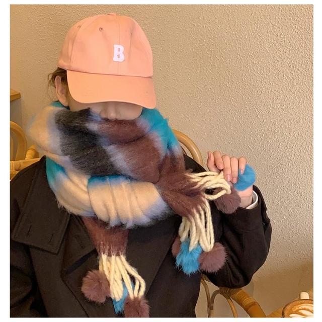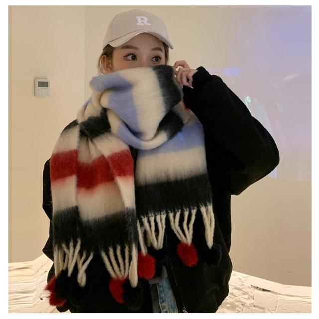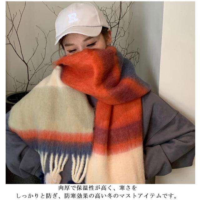 ポンポン付き マフラー 大判 ストール ボーダー柄 レディース 厚手 モヘア 大判ストール ボーダーマフラー ボリューム フリンジ かわいい おしゃれ ショール ひざ掛け 防寒 保温 大人可愛い 秋冬 誕生日 プレゼント ギフト 通勤 通学 学生 旅行 韓国風 【送料無料】