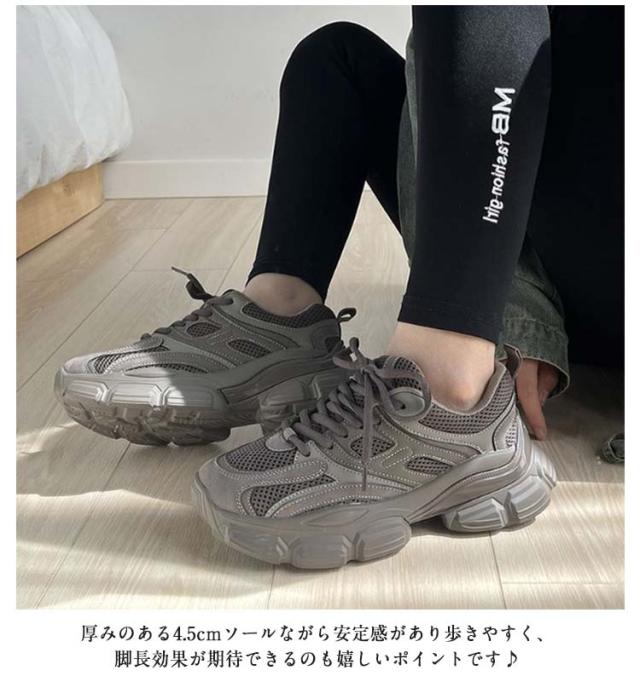 | ボリューム感満載のソールがトレンドライクで魅力的なダッドスニーカー! 厚みのある4.5cmソールながら安定感があり歩きやすく、脚長効果が期待できるのも嬉しいポイントです♪ メッシュをふんだんに使ったアッパーは通気性に優れ、暑い季節の普段履きにも◎ アウトドアからタウンユースまで幅広く履いていただけるスニーカーです。 | |