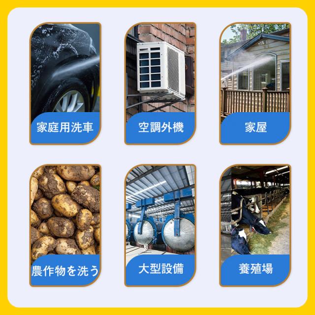 ポータブル洗車機のため、高圧水洗機は庭の散水や植木の水やり、打ち水などに便利です。マンションなどのベランダと窓はもちろん、車、バイク、自動車、自転車などの洗車機器、年末など定期掃除、BBQなどキャンプ用品の掃除、 庭の植木散水、お風呂や室内汚れの掃除、農産物の泥洗浄、塩害や台風後など大面積の地面掃除など場合におすすめます。