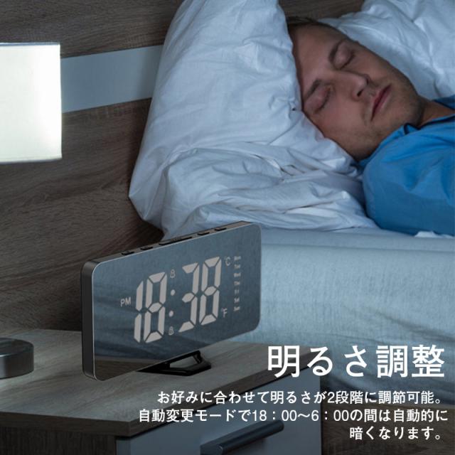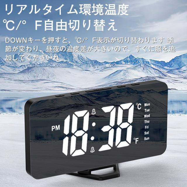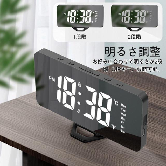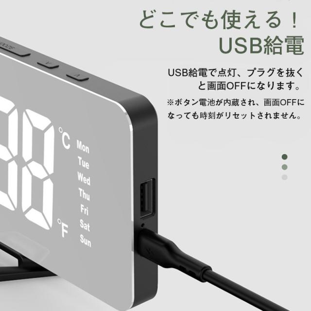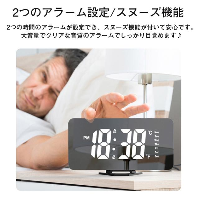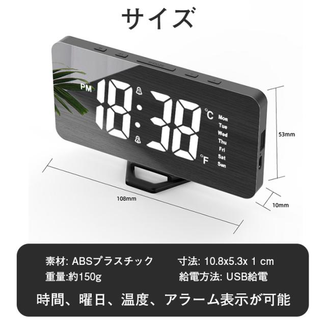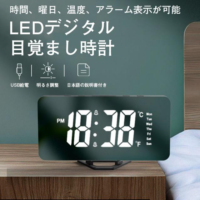 置き時計 LED 目覚まし時計 アラーム USB給電 曜日 おしゃれ 置時計 クロック 卓上 デジタル時計 めざまし時計 シンプル 鏡面 ミラー
