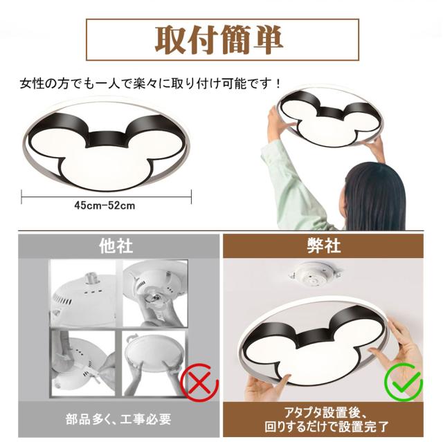 無段階調光調色&省エネ長寿命:リモコンを使用して、好みに応じてさまざまな色温度と明るさを調整します、さまざまな照明効果を実現できます。優れたled光源を採用し、均一に広がる光がお部屋全体を美しく照らします、光は柔らかく、まぶしいことはなく、目を保護します、消費電力は白熱灯より約半分!引掛シーリング取付&工事不要:この製品には、日本照明器具取付基準に適合した引掛式取付部品が付属します。本体は軽くて、例え初心者、女性一人でも、機械が苦手な人でも簡単に付けられます。工事不要の上に装着の手順も複雑ではありません。