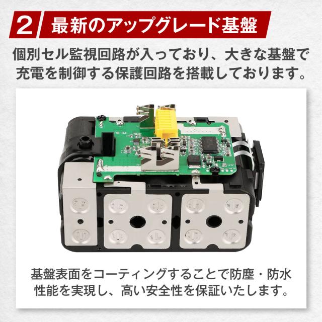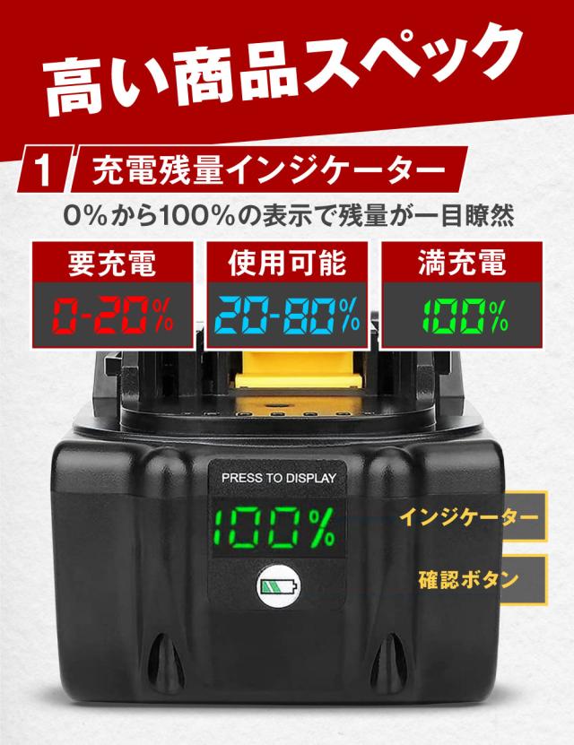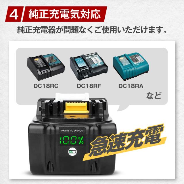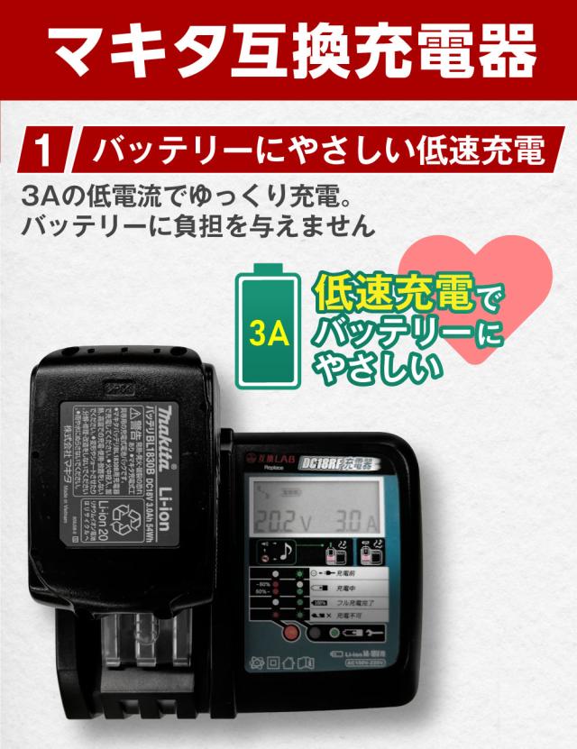 | 商品特徴 | 【保証について】 製造を担当しているのは互換バッテリーで高い評価を受けているWaitley社です。 12ヶ月の長期保証は製品への自信の証。 製造物責任保険でカバーされているので、万が一の不具合等にもお客様窓口にて対応いたします。 安価な粗悪品で苦労されている方にオススメです。 互換充電器や互換バッテリーを使うのが初めてで不安という方にも安心してお使いいただけます。 【マキタ互換バッテリー】 ■機能と安全性 視認性の高いパーセンテージでの充電残量表示機能を搭載。 個別セル監視回路が入り、大きな基盤で充電を制御する保護回路を搭載。 基板表面のコーティングで防塵防水性能に優れています。 ■マキタの同電圧全機種に対応 マキタ純正の電動工具はもちろん、草刈機、掃除機、集塵機、ブロアー、空気入れなど18Vの機種には全て対応しており、問題なくご使用いただけます。 ■純正充電器でフルスピード充電 DC18RC、DC18RF、DC18RAなどの純正バッテリー充電器での充電も可能です。 バッテリー搭載のメモリチップが使用履歴を記憶し、充電時にこの履歴をデジタル通信で充電器に送ることで、バッテリの状態(高温、満充電後の再充電、過放電など)を判断して、最適な方法と時間で充電します。 【マキタ互換充電器】 ■あんしんの低速充電 通常の充電よりもゆっくりと充電を行うので、バッテリーに負担をかけません。 特に互換バッテリーを急速充電器で充電するのは危険とされているので、互換バッテリーには互換充電器をオススメいたします。 冷却ファンも備え、内部構造はヒートシンク構造と、徹底的に「安全」「あんしん」にこだわりました。 ※純正充電器よりも満充電までに時間がかかることはご承知ください。 ■充電状況がひと目でわかる液晶ディスプレイ 大きな液晶ディスプレイを備えているので充電の状況がひと目でわかります。 充電開始時、完了時には音楽も流れるので、使いやすくなっております。 ■対応バッテリー 14.4v〜18vに対応。 互換LAB MKT互換バッテリー 6Ah 9Ah 6.0 9.0 BL1415 BL1430 BL1440 BL1450 BL1460BL1815 BL1830 BL1840 BL1850 BL1860など |