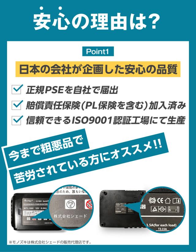 日本の会社が安全性や品質にこだわって企画し、正規のPSEの届け出を自社で行い、ISO9001認証の信頼できる中国工場にて生産しているMAKITA互換バッテリーと互換充電器のセットです。
