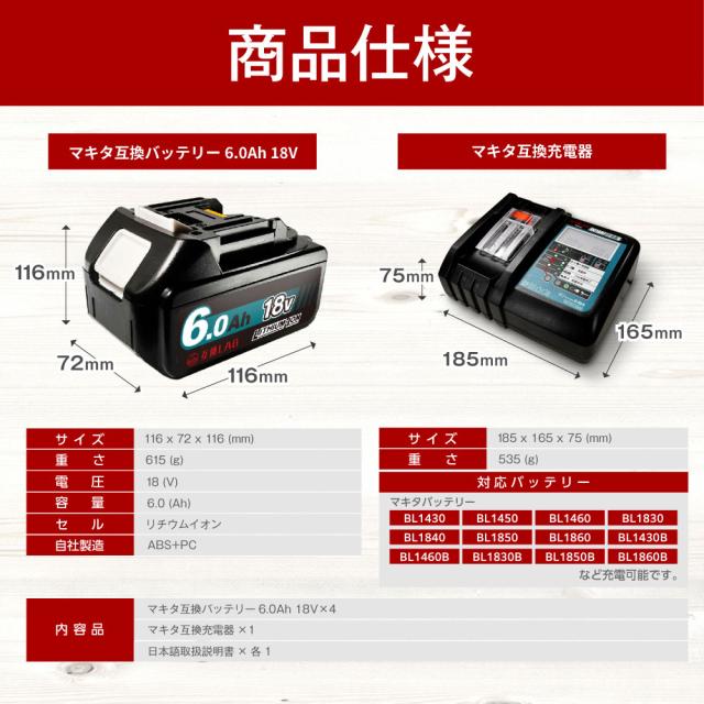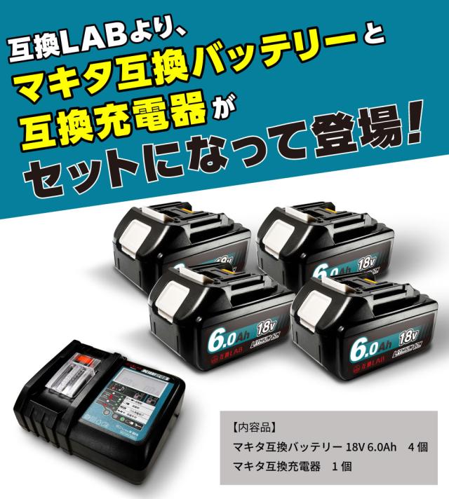 | 商品名 | 互換LAB MAKITA互換バッテリー18V 6.0Ah 4個セット & DC18V MAKITA互換充電器 |