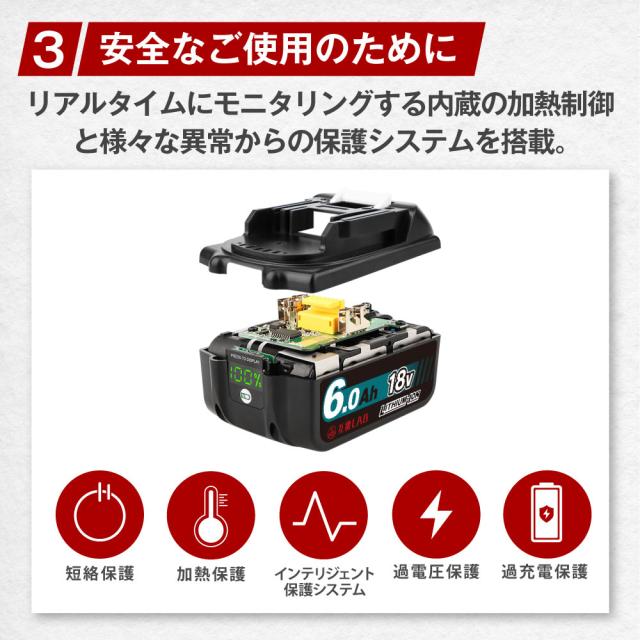 | 商品説明 | 日本の会社が安全性や品質にこだわって企画し、正規のPSEの届け出を自社で行い、ISO9001認証の信頼できる中国工場にて生産しているMAKITA互換バッテリーと互換充電器のセットです。 マキタ純正の電動工具はもちろん、草刈機、掃除機、集塵機、ブロアー、空気入れなど18Vの機種には全て対応しており、問題なくご使用いただけます。 |