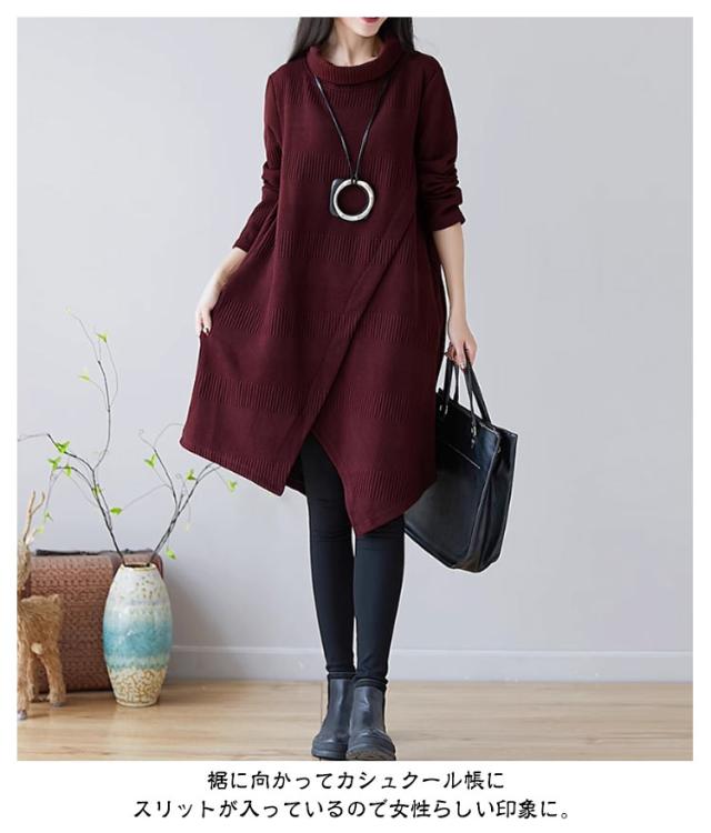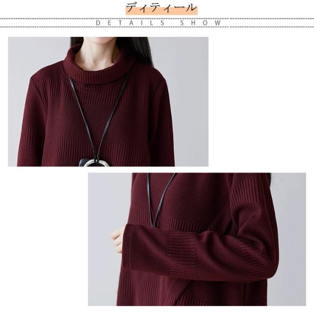 膝下 スリット 長袖 リブ ミディアム丈 ゆったり タートルネック ワンピース ニット 清楚 レディース 冬 膝丈 ミディ丈 秋冬 秋 チュニック丈 カジュアル チュニック ニット 膝上 リブニット 森ガール 上品 薄手 無地 緑 赤 カーキ ボルドー