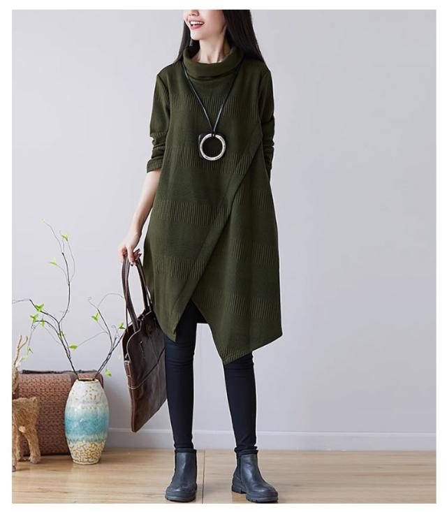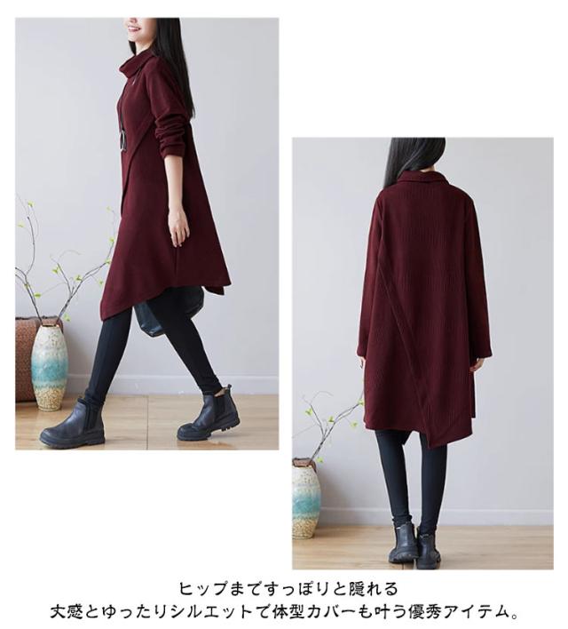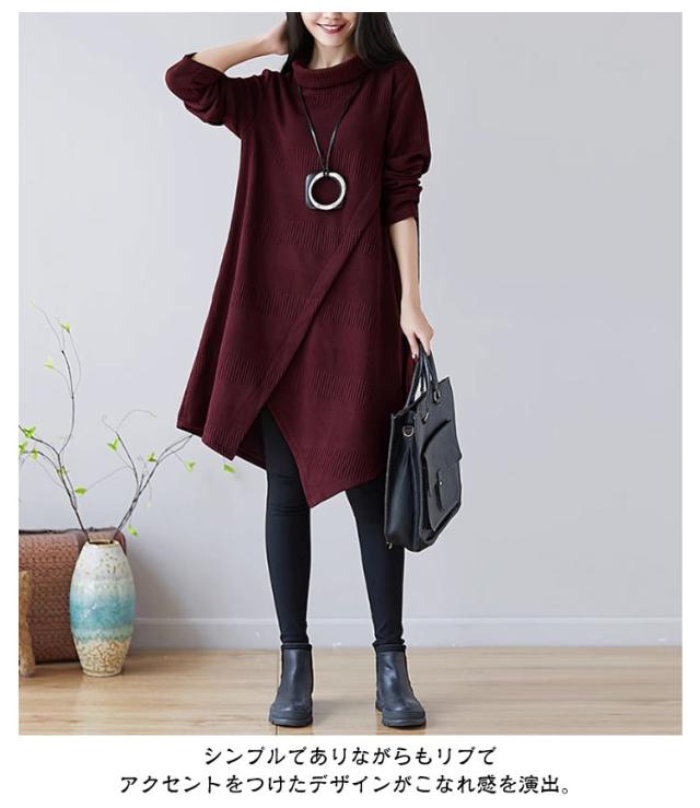 リブ スリット ニット タートルネック ミディアム丈 ワンピース ゆったり 薄手 上品 清楚 リブニット レディース 膝丈 チュニック カジュアル 秋 秋冬 冬 膝下 チュニック丈 膝上 ミディ丈 森ガール セーター ニット 無地 緑 赤 カーキ ボルドー