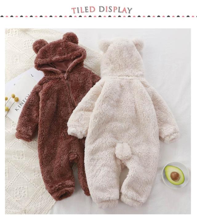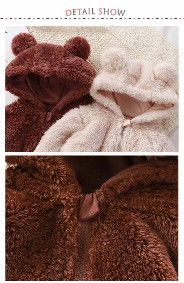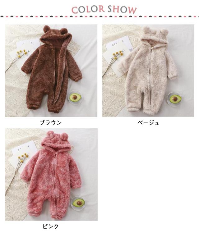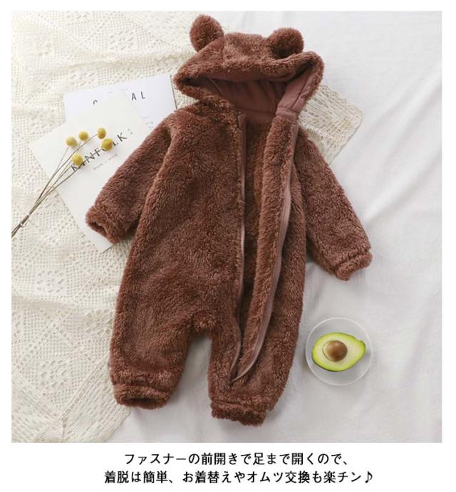 | 【フリース・ロンパース】【63〜110cm】 ベビーちゃんがカワイイクマさんに大変身! 赤ちゃんの頭から足まですっぽりと包んでベビーロンパースです。 ファスナーの前開きで足まで開くので、着脱は簡単、お着替えやオムツ交換も楽チン♪ ふんわりもこもこ、柔らかく軽いフリース素材。 ふんわり柔らかな肌ざわりで、軽い着心地が魅力です。 お誕生日や特別な日のプレゼントにも最適です。 | |