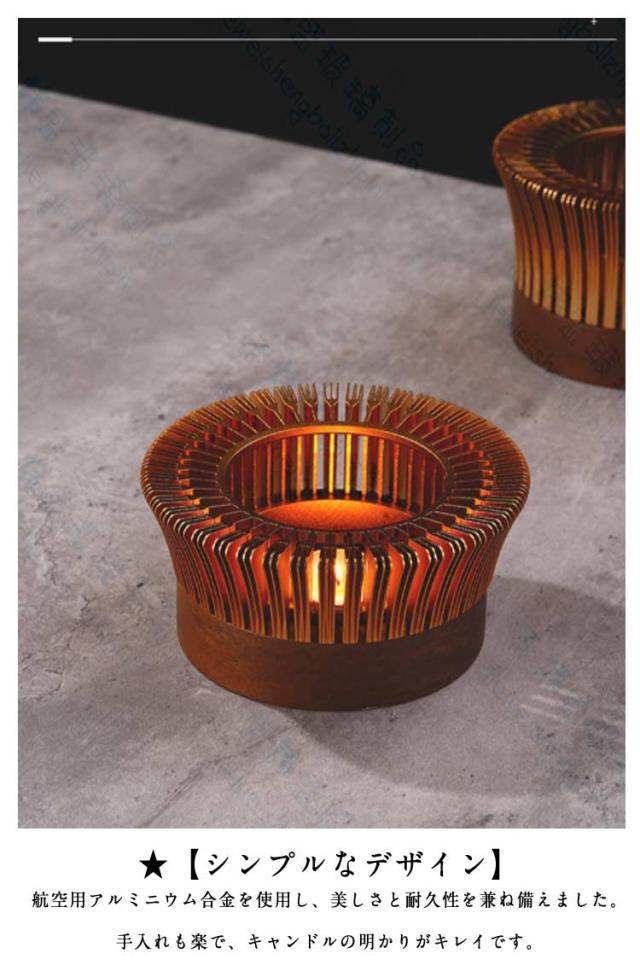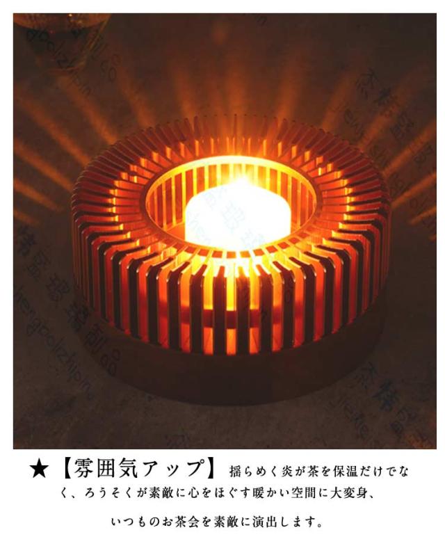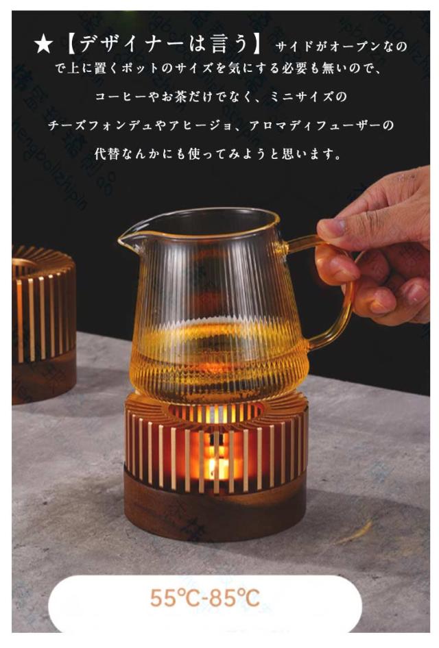 | ★【用途】キャンドルによる炎でティーポットを温め、お茶を長時間温かく飲むことが出来ます。小さな鍋や耐熱の容器があれば フォンデュやホットワインも 楽しめます。 ★上に陶器の皿を乗せて茶香炉にもなりますね。 ★ロウソクを付けて、ゆらゆら揺れる炎をボーッと眺めるルームランプの代わりや、停電などの緊急時にも使用可能かも。 ★【デザイナーは言う】サイドがオープンなので上に置くポットのサイズを気にする必要も無いので、コーヒーやお茶だけでなく、ミニサイズのチーズフォンデュやアヒージョ、アロマディフューザーの代替なんかにも使ってみようと思います。 ★【雰囲気アップ】揺らめく炎が茶を保温だけでなく、ろうそくが素敵に心をほぐす暖かい空間に大変身、いつものお茶会を素敵に演出します。キャンドルの炎が トロトロ感をキープして パーティを演出してくれます。★また、精油を揮発させて、いい香りが部屋を漂っていますね。あたたかい雰囲気を作り出します。 ★【シンプルなデザイン】航空用アルミニウム合金を使用し、美しさと耐久性を兼ね備えました。手入れも楽で、キャンドルの明かりがキレイです。シンプルなデザインなのでどんなインテリアにも合わせやすいのも魅力的です。これでしたら屋外に持ち出しても壊れにくいのでピクニックアイテムとしても使えます。★上下のカバーが分離しており、キャンドルを簡単に交換できます。 | |