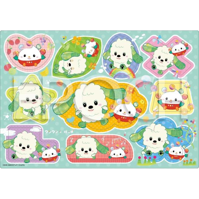 ●「遊べるシート」または「学習シート」付き。パズルと合わせて楽しめます。NHK Eテレ「いないいないばぁっ!」のワンワンとぽぅぽのパズル。ピースが図形のかたちになっていて組みやすいです。初めての物に興味津々な時期に「親子あそび」で安心感と好奇心を育みます。