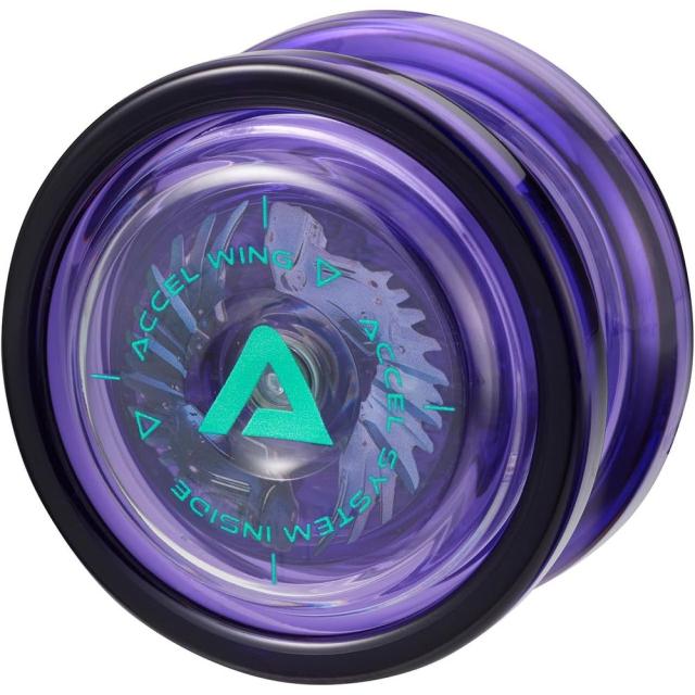 「ハイパーヨーヨーアクセル アクセルウィング-テクノパープル-」は、クリアパープルのボディに機械生命体をイメージした羽のデザインがあしらわれたヨーヨーです。