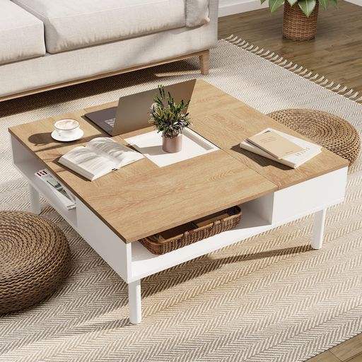 WAMPATローテーブル センターテーブル 正方形 木制 コーヒーテーブル ちゃぶ台 座卓 コンパクト収納 隠し収納スペース付き リビング用テーブル 幅80×奥行80CM×高さ33CM ホワイトオーク W02K2088N