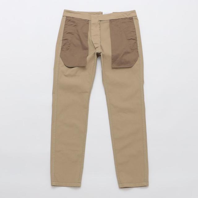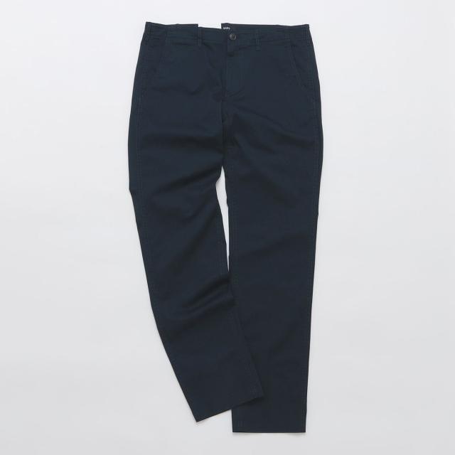 定番のテーパードチノパンツよりも少し細番手の糸を使用し、横糸にはストレッチ糸をフルに使用。