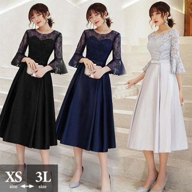 発表会 ドレス パーティードレス 演奏会 ドレス ブラック 黒 ネイビー 紺 グレー 灰色 ミモレ丈 ミモレドレス Aライン 長袖 袖あり 結婚式 母親 フォーマル 小さいサイズ 大きいサイズ 女子会