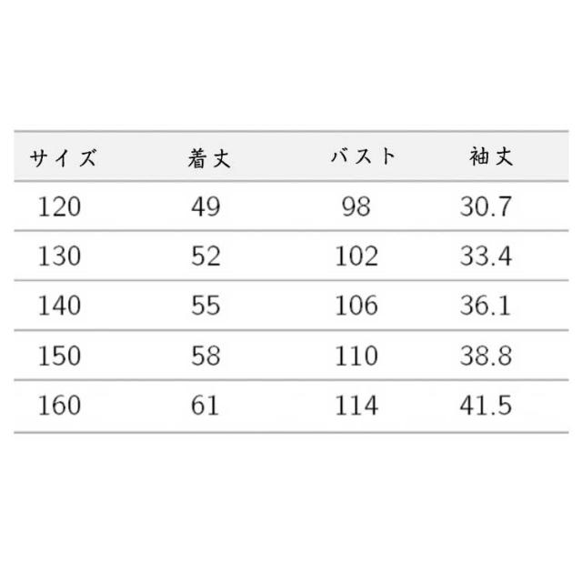 | サイズについての説明 | 110 着丈(46cm) バスト(94cm) 袖丈(28cm) 120 着丈(49cm) バスト(98cm) 袖丈(30.7cm) 130 着丈(52cm) バスト(102cm) 袖丈(33.4cm) 140 着丈(55cm) バスト(106cm) 袖丈(36.1cm) 150 着丈(58cm) バスト(110cm) 袖丈(38.8cm) 160 着丈(61cm) バスト(114cm) 袖丈(41.5cm) ※測定方法によって誤差が生じますので、予めご了承下さい。 |