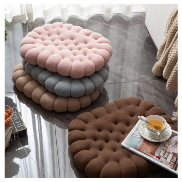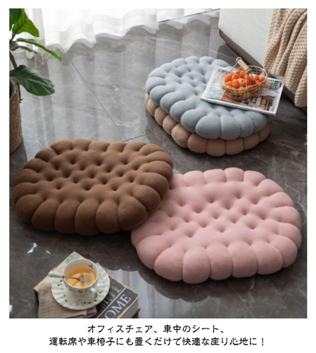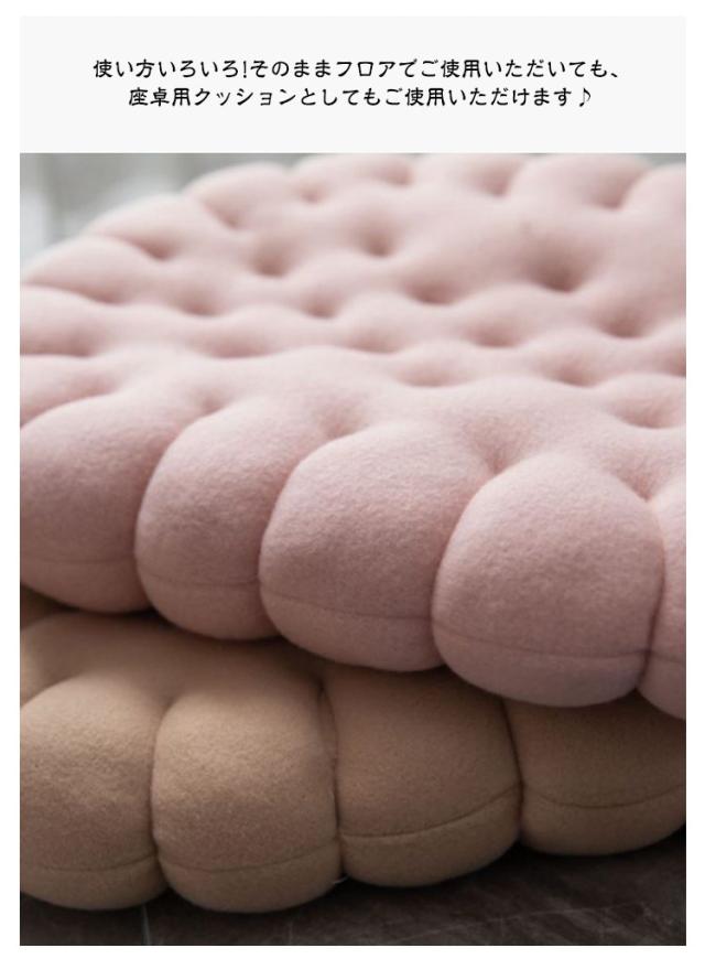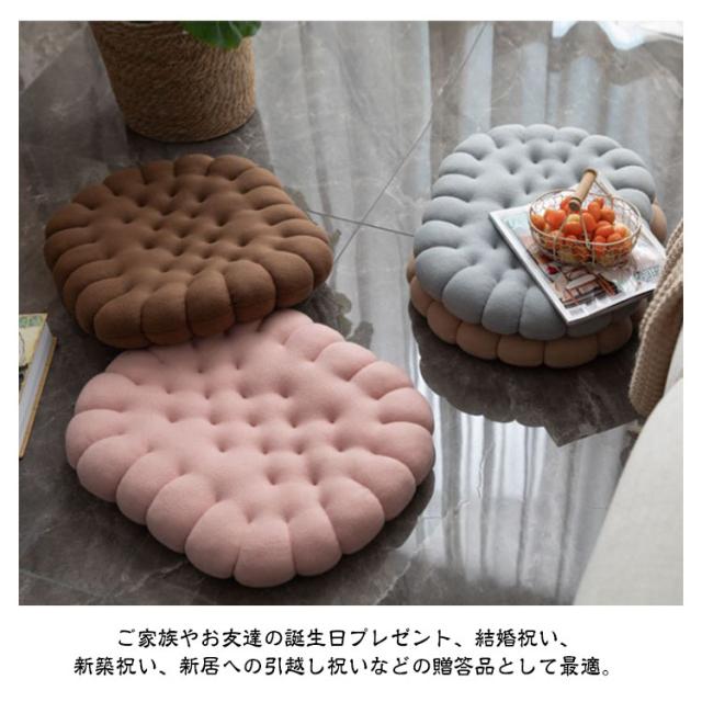 | ビスケットのようなかわいい座布団。 使い方いろいろ!そのままフロアでご使用いただいても、座卓用クッションとしてもご使用いただけます♪ オフィスチェア、車中のシート、運転席や車椅子にも置くだけで快適な座り心地に! 柔らかいPP綿を詰まっていてお尻を優しくサポート。長時間座られる方におすすめです。 ご家族やお友達の誕生日プレゼント、結婚祝い、新築祝い、新居への引越し祝いなどの贈答品として最適。 | |