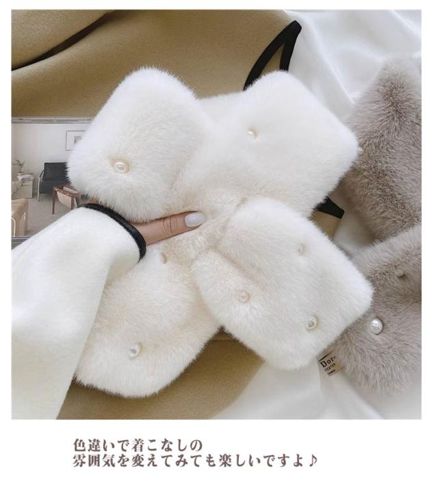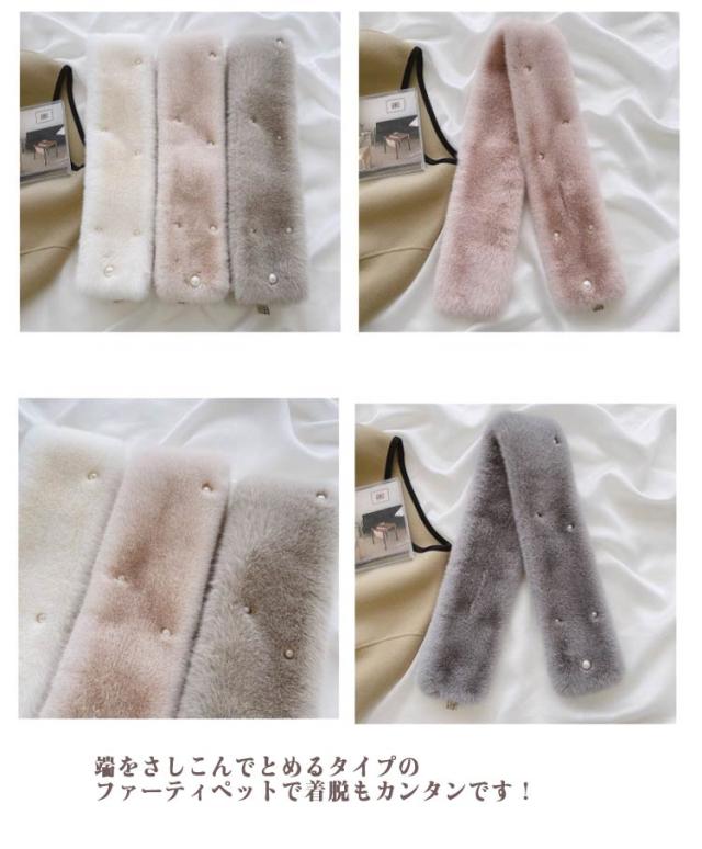 | パールがフェミニンでかわいらしいファーティペットです! 普段使いからお出かけまで幅広くお使いいただけます。 色違いで着こなしの雰囲気を変えてみても楽しいですよ♪ 端をさしこんでとめるタイプのファーティペットで着脱もカンタンです! | |