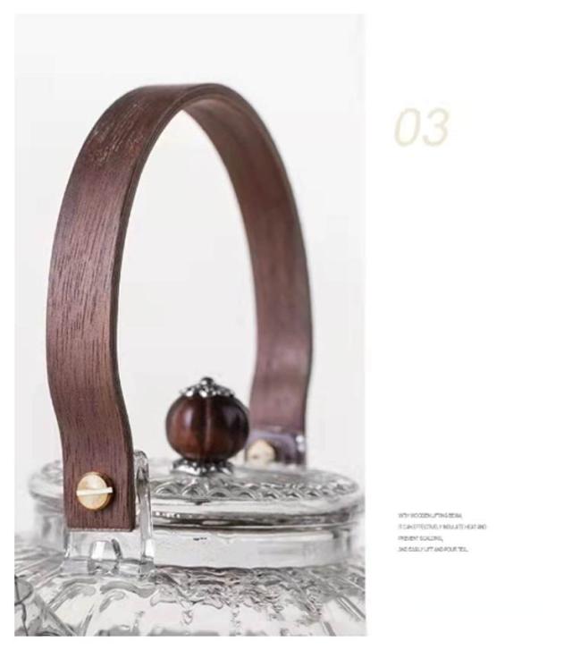 | 800ml 木製ハンドル、耐熱性、火傷防止、お茶を注ぎやすい 注ぎ口は鷲のくちばしで設計されており、注ぐときにお茶を排出し、漏れを防ぎます。 高ホウケイ酸ガラスは耐熱性と透明性に優れています。 | |