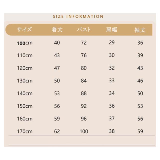 | サイズについての説明 | 100 着丈40cm バスト72cm 肩幅29cm 袖丈36cm 110 着丈43cm バスト76cm 肩幅30cm 袖丈39cm 120 着丈47cm バスト80cm 肩幅32cm 袖丈43cm 130 着丈50cm バスト84cm 肩幅33cm 袖丈46cm 140 着丈53cm バスト88cm 肩幅34cm 袖丈50cm 150 着丈56cm バスト92cm 肩幅36cm 袖丈53cm 160 着丈59cm バスト96cm 肩幅37cm 袖丈56cm 170 着丈62cm バスト100cm 肩幅38cm 袖丈59cm |