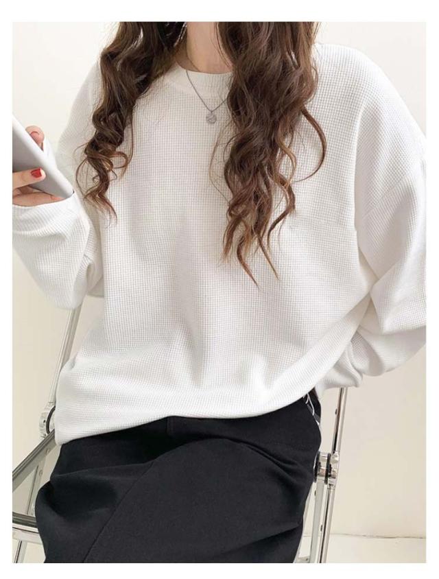 トレーナー 春秋 トップス レディース 韓国ファッション スウェット 長袖 Tシャツ ゆったり シンプル 着痩せ ワッフル ドロップショルダー 無地 おしゃれ カジュアル 大きいサイズ