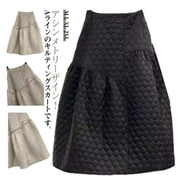 アシンメトリー ロングスカート フレアスカート Aラインスカート キルティングスカート 中綿入り スカート ロング丈 アシンメトリー M 暖かい おしゃれ きれいめ L XL