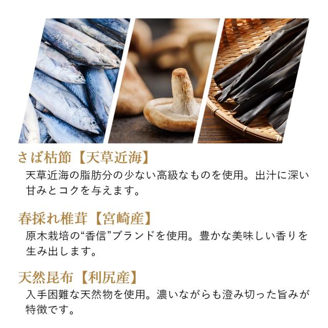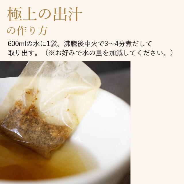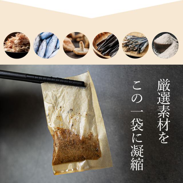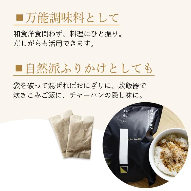 一袋で叶える、料理の格上げ。 贅沢なひとときを、あなたの食卓に 厳選国産の天然素材×自然由来の安心の原材料 豊かな旨味と芳醇な香りを引き出す極上ブレンド ■極上のだし 600mlの水に1袋、沸騰後中火で3〜4分煮だして取り出す。(※お好みで水の量を加減してください。) ■万能調味料 和食洋食問わず、料理にひと振り。だしがらも活用できます。 ■自然派ふりかけ 袋を破って混ぜればおにぎりに、炊飯器で炊きこみご飯に、チャーハンの隠し味に。 |