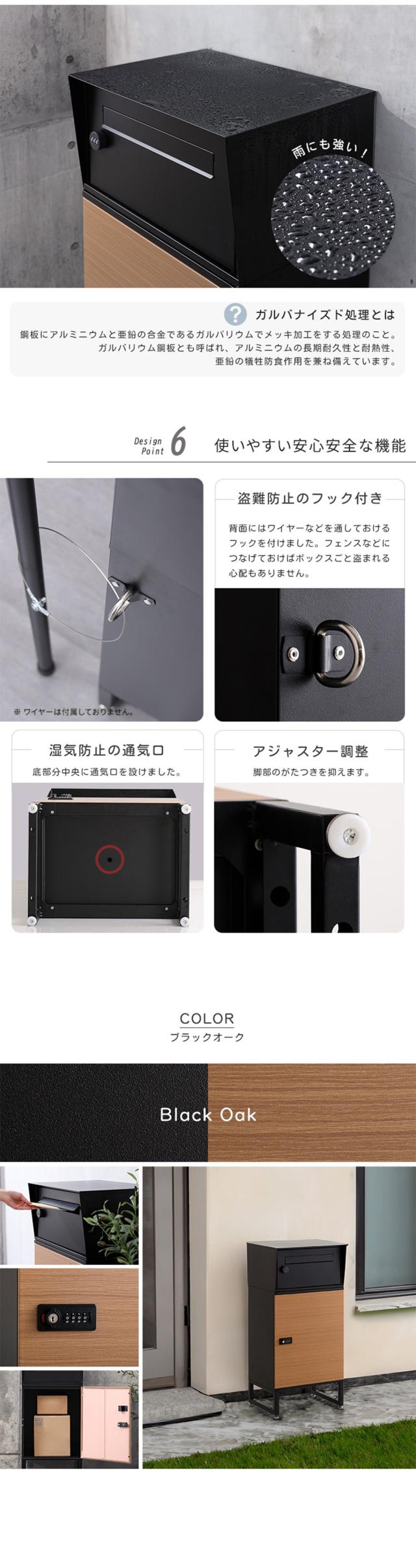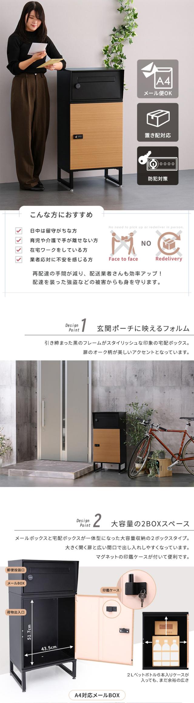 ブラック×オーク色のデザインの宅配ボックス。インテリアとして、コンパクトでおしゃれなデザインです。
