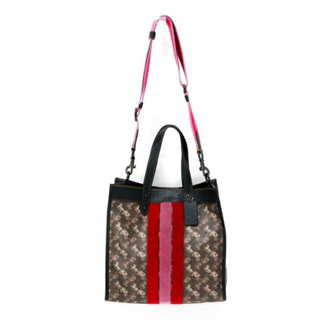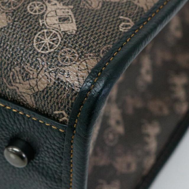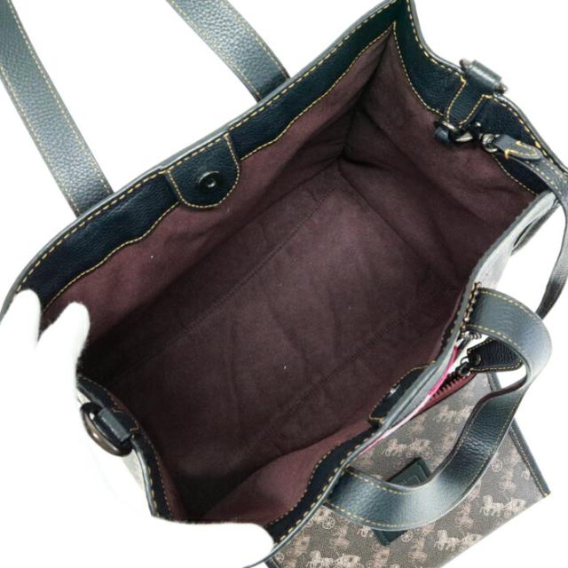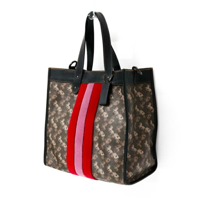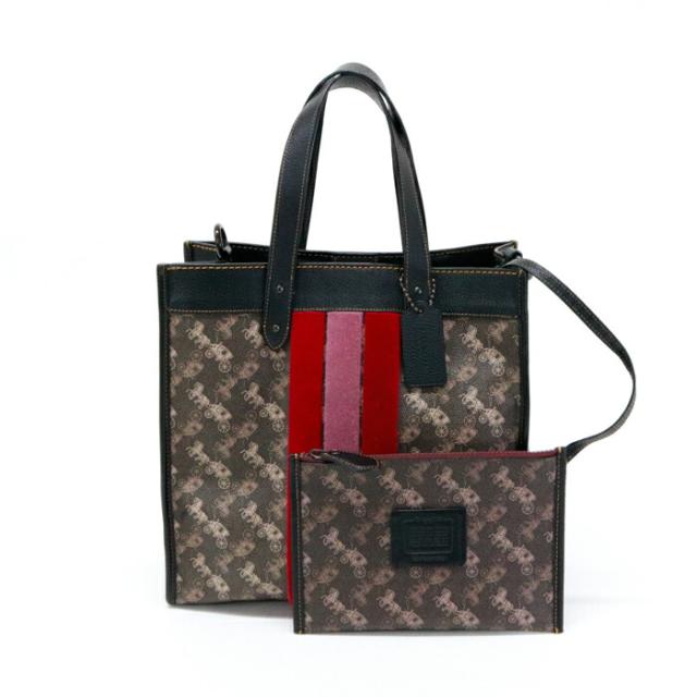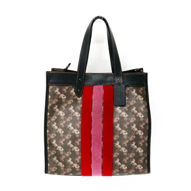 コーチ COACH フィールドトート ホースアンドキャリッジ プリント アンド ヴァ—シティストライプ PVC / ポリッシュド ペブル レザー 79366 トートバッグ 2WAYバッグ ショルダーバッグ ハンドバッグ レディース ブラウン / ブラック 中古 mbe30022