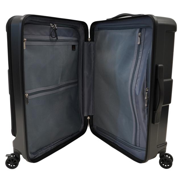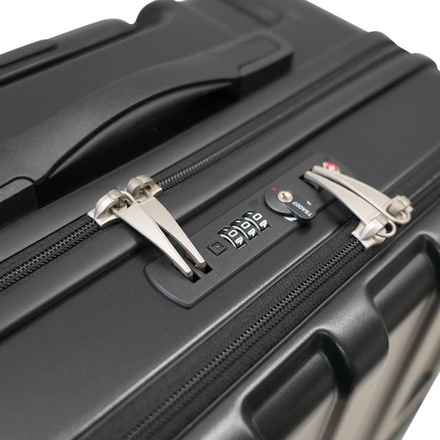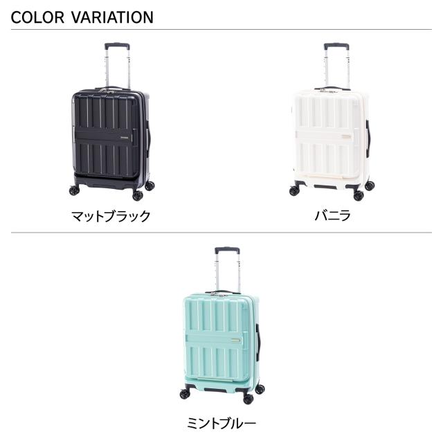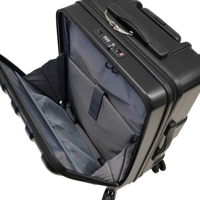 フロントオープン機能を搭載し、荷物の出し入れが素早く行えます。内部の荷物も前から取り出せるダイレクトファスナー仕様で、利便性がよりアップ。抜群の走行安定性・旋回性を誇る大径50mmダブルホイールキャスターが、凹凸のある路面で実力を発揮します。前輪部には簡単に操作可能なストッパー機能を搭載。電車内や坂道などで便利です。高純度ポリカーボネイト100%のボディは軽量かつ頑丈です。耐摩耗性に優れ、壊れにくいYKK社製ファスナーを採用しています。ボディ下部のボトムハンドルは、荷下ろしに便利です。