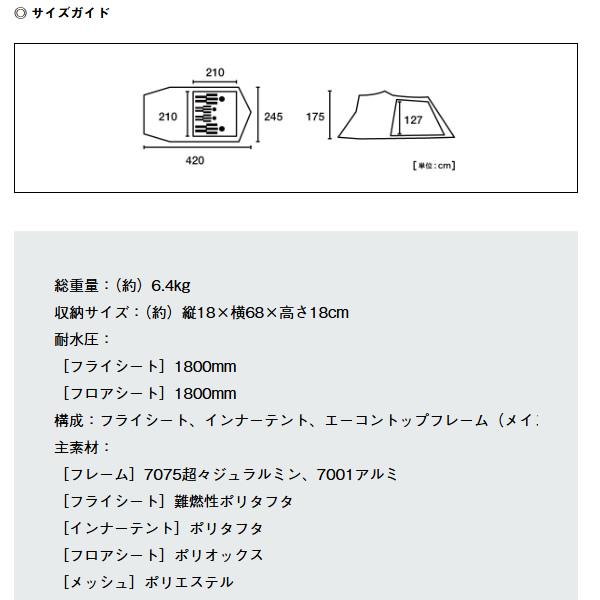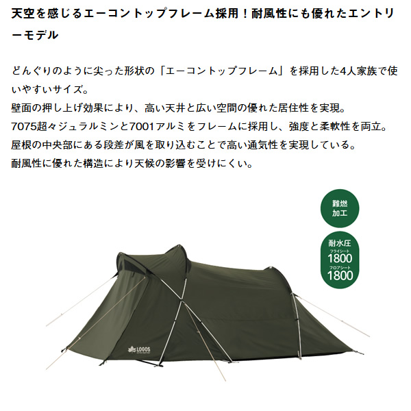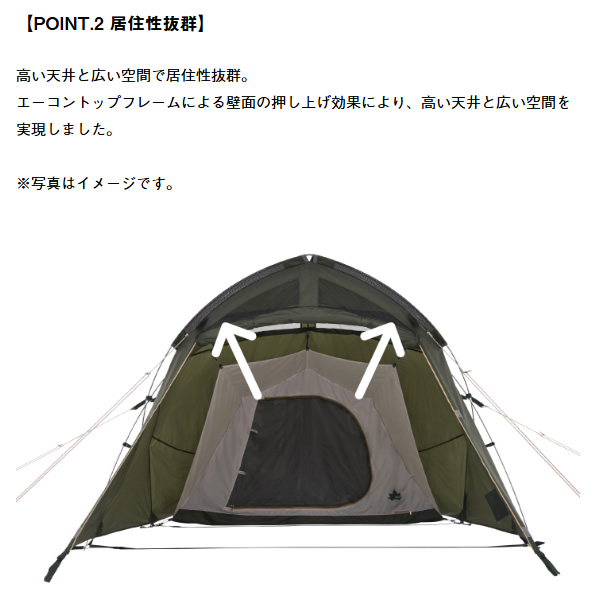・天空を感じるエーコントップフレーム採用!耐風性にも優れたエントリーモデル。 ・エーコントップフレームには強度と柔軟性を兼ね備えた 7075超々ジュラルミンと7001アルミのハイブリットフレーム ・エーコントップフレームは壁面の押し上げ効果によって広く高い内部空間を生み出します。 ・屋根にうまれた段差はベンチレーション(AIR INLET ROOF)として風を効果的に取り込むことで空気を循環し、快適な居住性をもたらします。 ・フライシート AIR INLET ROOF、防水加工(耐水圧1800mm)、撥水加工(3級以上)、難燃加工(米国基準CPAI-84適合)UV-CUT加工(90%以上)、SUPPORT BELT SYSTEM、ベンチレーション、バックドア、回転式ジッパー ・インナーテント ブリザーブル撥水加工、回転式ジッパー ・3〜4人用 ※記載は商品仕様の一部です。仕様説明不足等の理由での返品はできません。特に適合等は必ずご確認ください。