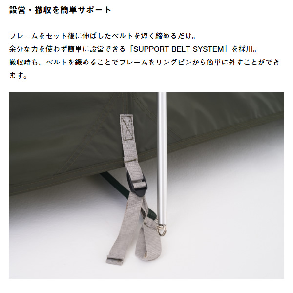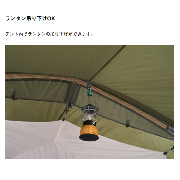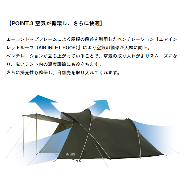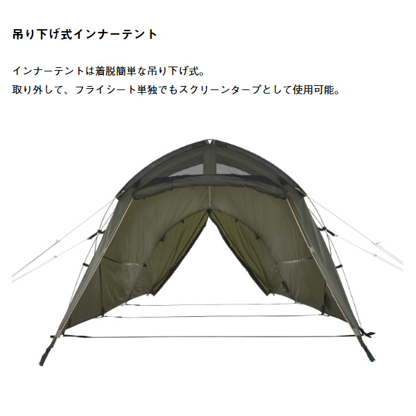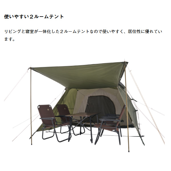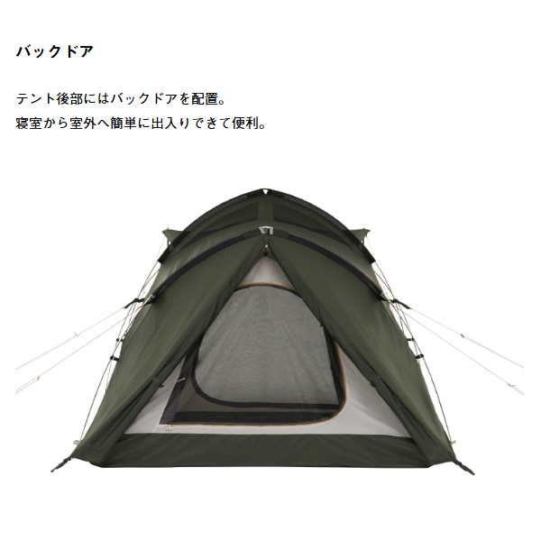 ・フライシート AIR INLET ROOF、防水加工(耐水圧1800mm)、撥水加工(3級以上)、難燃加工(米国基準CPAI-84適合)UV-CUT加工(90%以上)、SUPPORT BELT SYSTEM、ベンチレーション、バックドア、回転式ジッパー