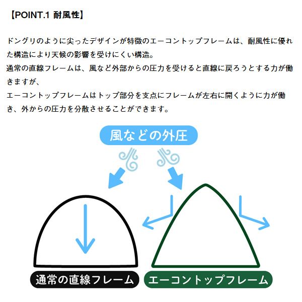 耐風性&居住性に優れたエーコントップフレーム採用。エーコントップフレームは壁面の押し上げ効果によって広く高い内部空間を生み出します。
