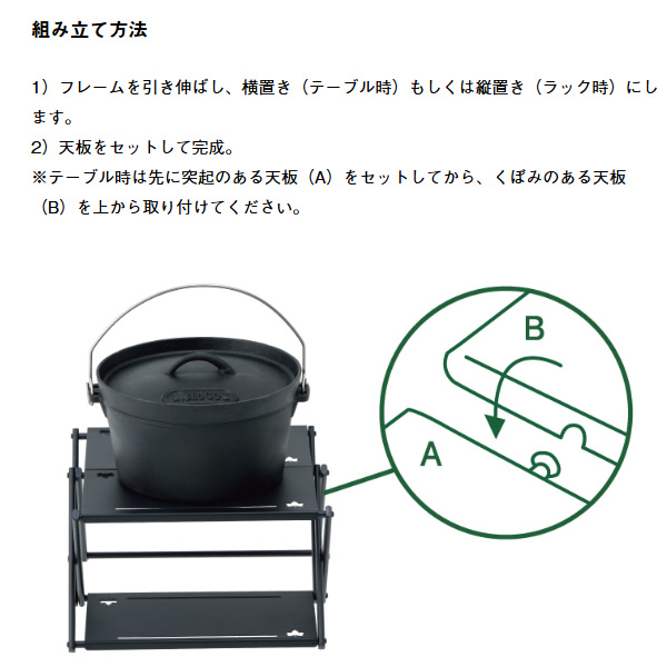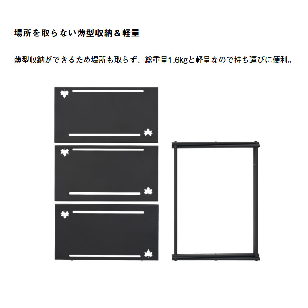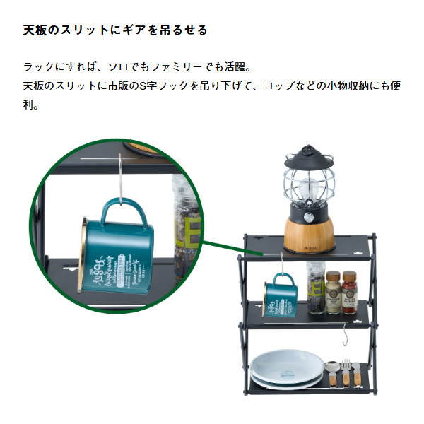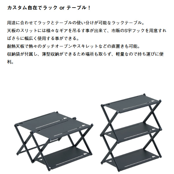 カスタム自在でラック or テーブル! 用途に合わせてラックとテーブルの使い分けが可能。 天板のスリットは様々なギアを吊るす事が出来て、S字フック(別売)を用意すればさらに幅広く使用する事が出来る。耐熱天板はダッチオーブン直置き可能。 ■総重量:(約)1.6kg ■サイズ: [ラック時](約)幅35×奥行17×高さ37cm [テーブル時](約)幅33.5×奥行33×高さ19.5cm ■収納サイズ:(約)縦28×横38×厚さ5cm ■耐荷重: [ラック時](約)5kg [テーブル時](約)15kg ■主素材:スチール ■構成:本体、収納バッグ ■性能/特長: ・カスタム自在でラック or テーブル! ・サイドテーブルにピッタリのテーブルサイズ ・ラックにすればソロでもファミリーでも活躍 ・耐熱天板はダッチオーブン直置き可能 ・天板のスリットにギアを吊るせる。 ・場所を取らない薄型収納 ※耐荷重表記は静止荷重による目安です。 ※記載は商品仕様の一部です。仕様説明不足等の理由での返品はできません。特に適合等は必ずご確認ください。