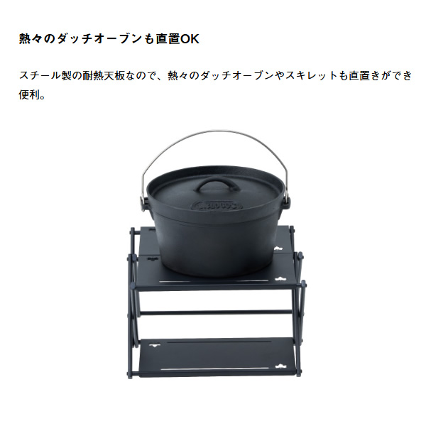 天板のスリットは様々なギアを吊るす事が出来て、S字フック(別売)を用意すればさらに幅広く使用する事が出来る。耐熱天板はダッチオーブン直置き可能。