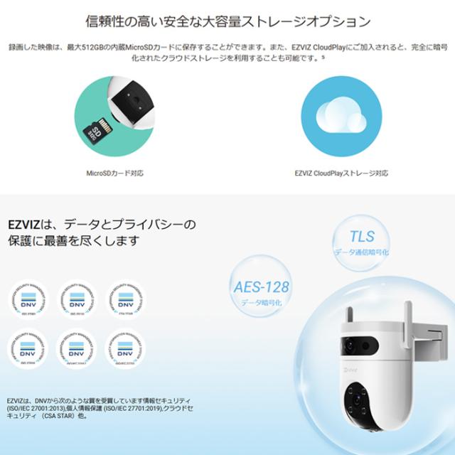 メモリーカード録画以外に、有料のクラウドストレージを使用した録画にも対応しております[EZVIZクラウド]。