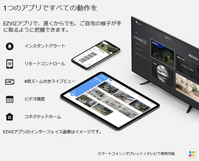 世界有数の防犯カメラメーカーHikvision(ハイクビジョン)社グループのコンシューマ向けブランド、EZVIZ(イージービズ)ブランドの製品で、1台での運用から複数台でも運用が可能な為、一般家庭から業務用途まで、様々な状況にご使用いただけます。