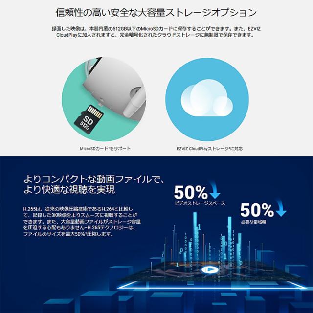 メモリーカード録画以外に、有料のクラウドストレージを使用した録画にも対応しております[EZVIZクラウド]。