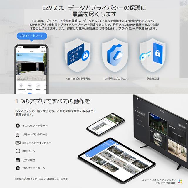 世界有数の防犯カメラメーカーHikvision(ハイクビジョン)社グループのコンシューマ向けブランド、EZVIZ(イージービズ)ブランドの製品で、1台での運用から複数台でも運用が可能な為、一般家庭から業務用途まで、様々な状況にご使用いただけます。