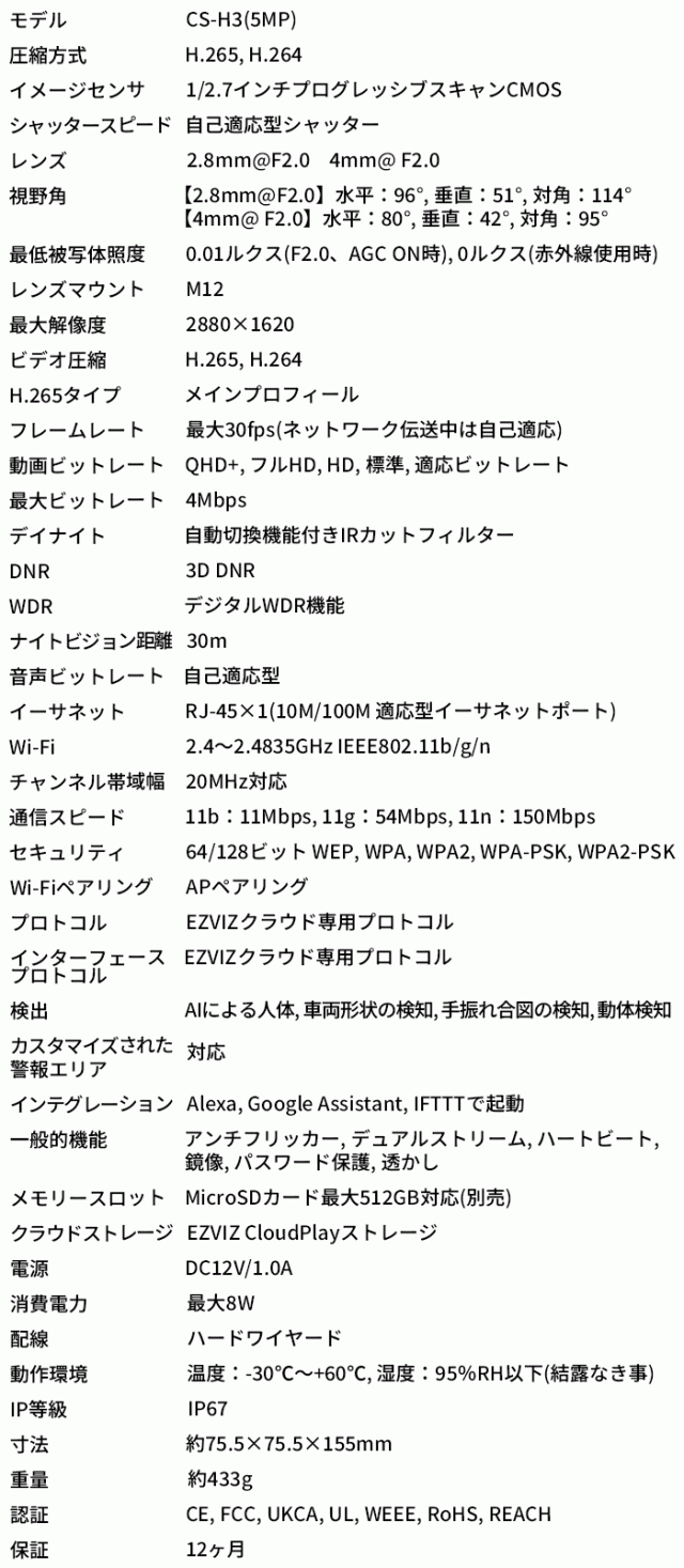 ■ CS-H3(5MP) 500万画素 Wi-Fiネットワークカメラ